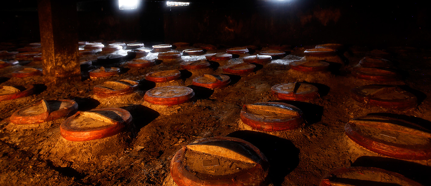地下酒窖總占地面積3322平方米,總建筑面積5658平方米,窖內(nèi)共有陶壇3800余只,儲(chǔ)酒陶壇壇齡在百年以上,被譽(yù)為“中國(guó)白酒的地下宮殿”。儲(chǔ)存的原酒在獨(dú)特的培土窖藏環(huán)境中,歷經(jīng)歲月沉淀,酒體自然老熟,成為滴滴珍貴的稀世陳釀,被稱為“液體黃金”。