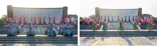 “泗水王劉靖”“婕妃”以諸侯之禮歡迎賓客,儀仗肅立、華蓋蔽日,再現(xiàn)興盛時(shí)期“大漢酒國”的榮耀與威儀。基地員工依諸侯禮節(jié)表演了六佾文舞,彩帶紛飛、古韻十足,展現(xiàn)了“仁義禮智信”的中華正統(tǒng)文化精髓。